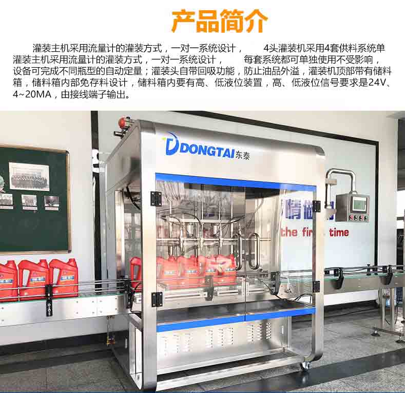 全自動潤滑油灌裝主機(jī)采用流量計的灌裝方式,一對一系統(tǒng)設(shè)計,4頭灌裝機(jī)采用4套供料系統(tǒng)單灌裝主機(jī)采用流量計的灌裝方式