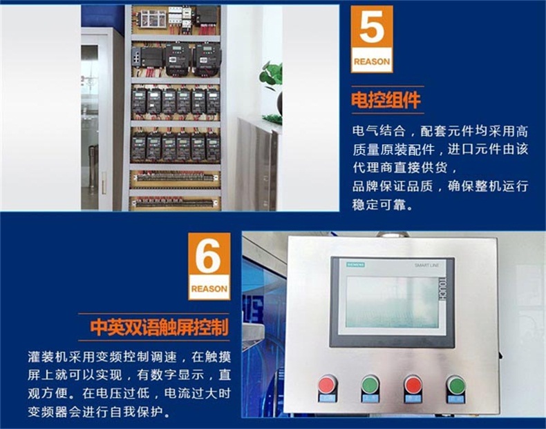 7.其他廠家采用調(diào)速電機(jī),靠手動旋轉(zhuǎn)電機(jī)上的轉(zhuǎn)輪來改變輸送帶的速度,調(diào)整只能憑感覺極為不方便。我們的灌裝機(jī)采用變頻控制調(diào)速,在觸摸屏上就可以實現(xiàn),有數(shù)字顯示,直觀方便。在電壓過低,電流過大時變頻器會進(jìn)行自我保護(hù)。