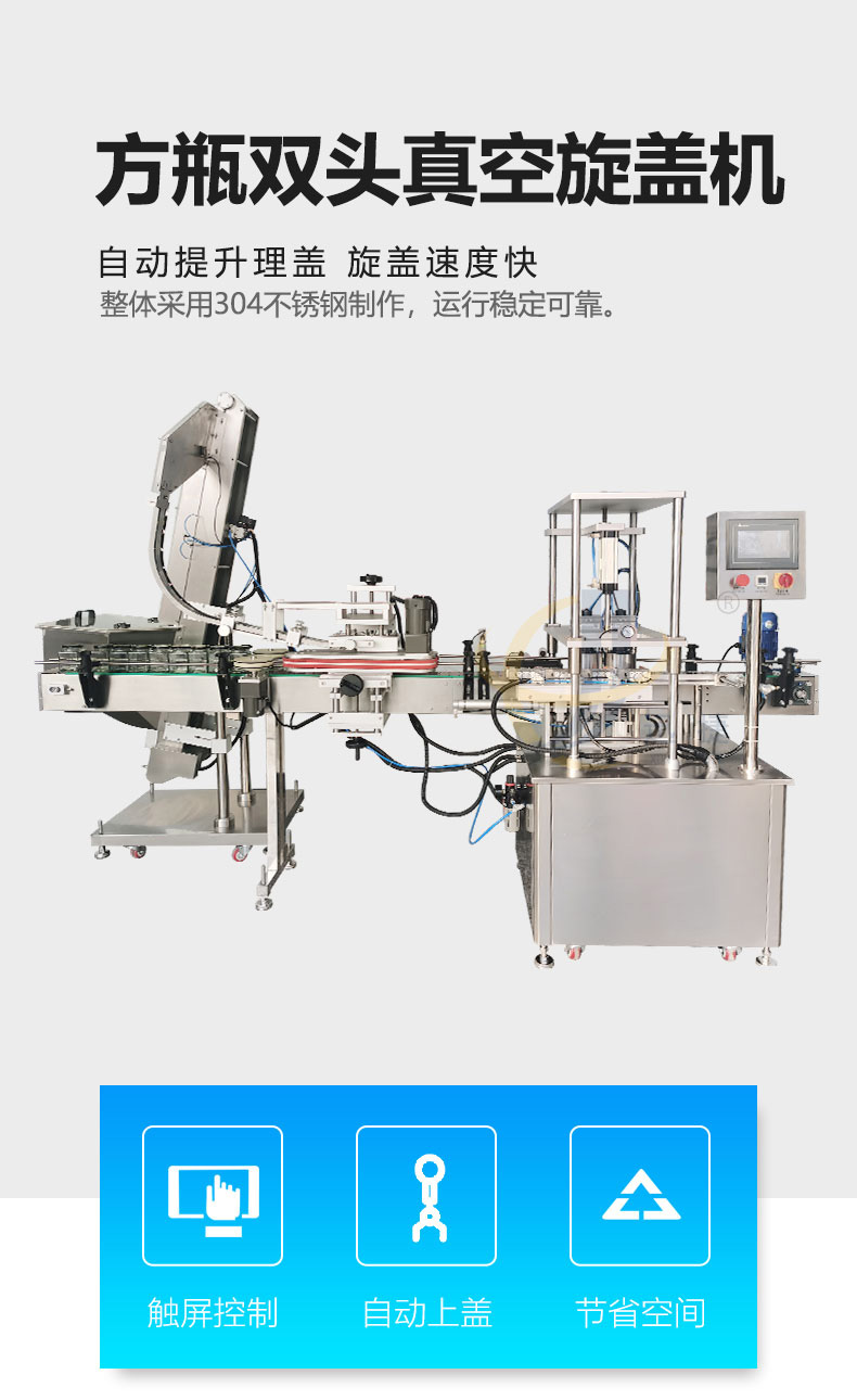 方瓶雙頭真空旋蓋機(jī)獨(dú)特的設(shè)計(jì),可兼容多種不同形狀,尺寸的瓶子旋蓋,兼容性強(qiáng),且調(diào)整方便;真空壓力可調(diào),觸摸屏人機(jī)界面操作簡單方便。