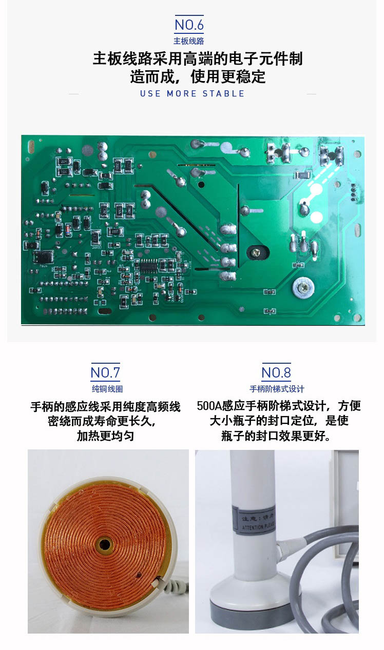 本機采用國外先進線路,選用日本新模塊化功率器件,較于一般電子感應加熱器更省電,熱效率達到90%以上,瞬時加熱速度為后者的20-30倍,因此不僅 適用于熱封性能較好的聚乙烯、聚丙烯材質(zhì)的瓶體,而且對熱封性能較差的聚酯瓶、玻璃瓶也有極好的封口效果。